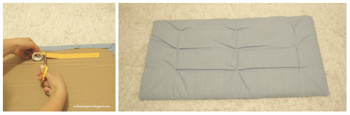 Stretch the fabric on the floor with the polyester wadding over it and the cardboard on the top.