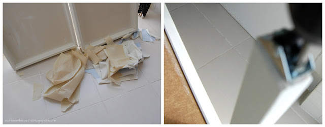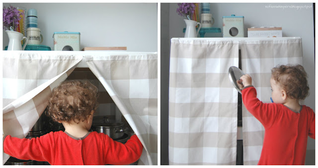 Passo seguinte. Trabalhar no tecido - fiz umas cortinas interiores para as portas de vidro e outras para o armário central.